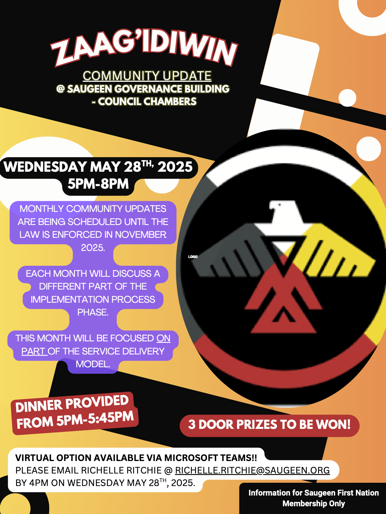 Monthly community updates are being scheduled until the law is enforced in November2025. Each month will discuss a different part of the implementation process phase. This month will be focused on part of the service delivery model. Date: Wednesday, May 28th Time: 5-8pm Location: Saugeen Governance Building, Council Chambers *Virtual option available, email Richelle.ritchie@saugeen.org by Wednesday,