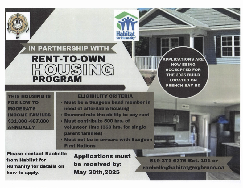 Applications are now being accepted for the 2025 build located on French Bay Rd. Eligibility Criteria Must be a Saugeen Band member in need of affordable housing Demonstrate the ability to pay rent Must contribute 500 hrs. of volunteer time (350 hours. for a single parent families) Must not be in arrears with Saugeen First
