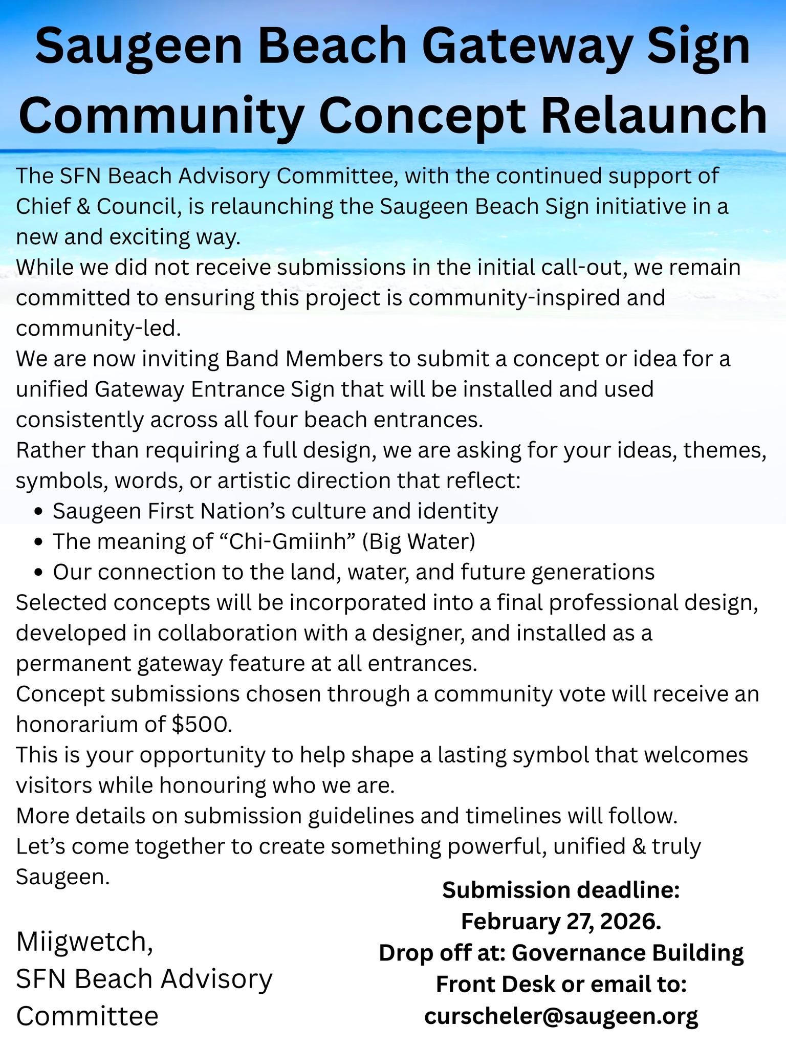 The SFN Beach Advisory Committee, with the continued support of Chief & Council, is relaunching the Saugeen Beach Sign initiative in a new and exciting way. While we did not receive submissions in the initial call-out, we remain committed to ensuring this project is community-inspired and community-led. We are now inviting Band Members to submit