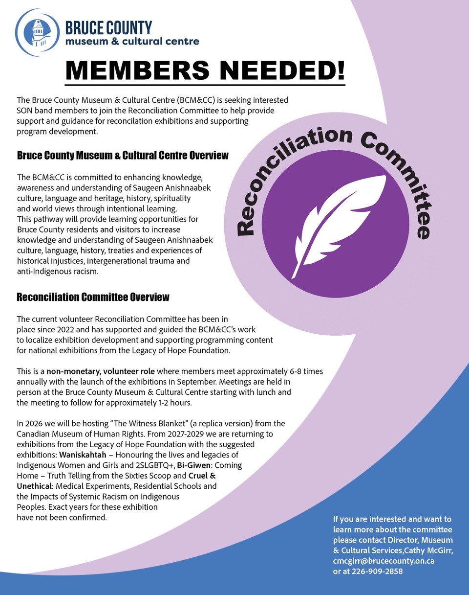 The Bruce County Museum & Cultural Centre (BCM&CC) is seeking interested SON band members to join the Reconciliation Committee to help provide support and guidance for reconciliation exhibitions and supporting program development. Bruce County Museum & Cultural Centre Overview The BCM&CC is committed to enhancing knowledge, awareness and understanding of Saugeen Anishnaabek culture, language and